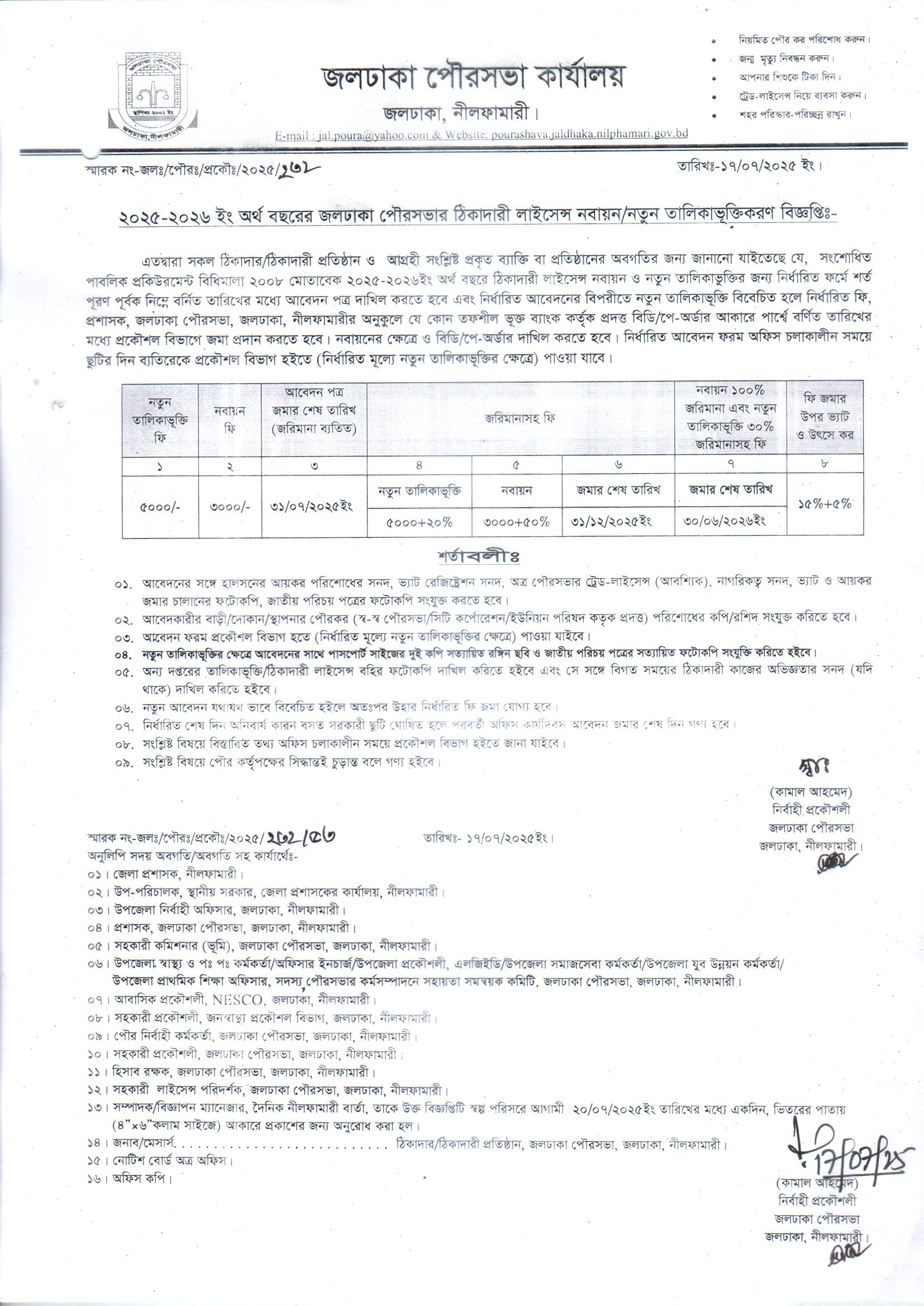 2025-2026 ইং অর্থ বছরের জলঢাকা পৌরসভার ঠিকাদারী লাইসেন্স নবায়ন/নতুন তালিকাভূক্তিকরন বিজ্ঞপ্তি